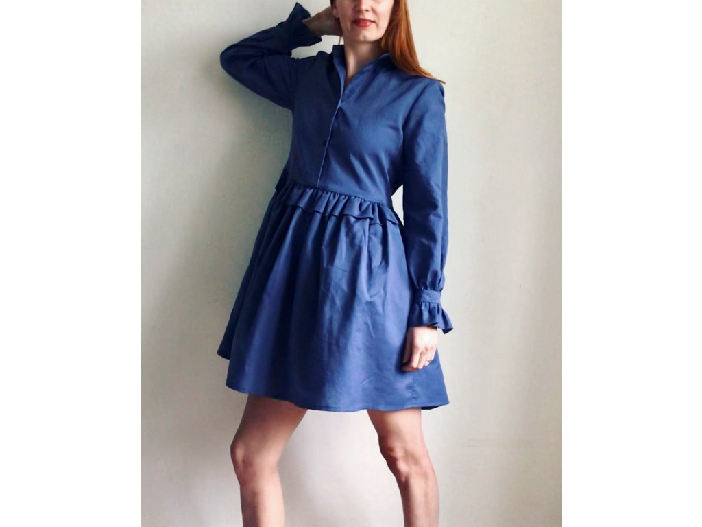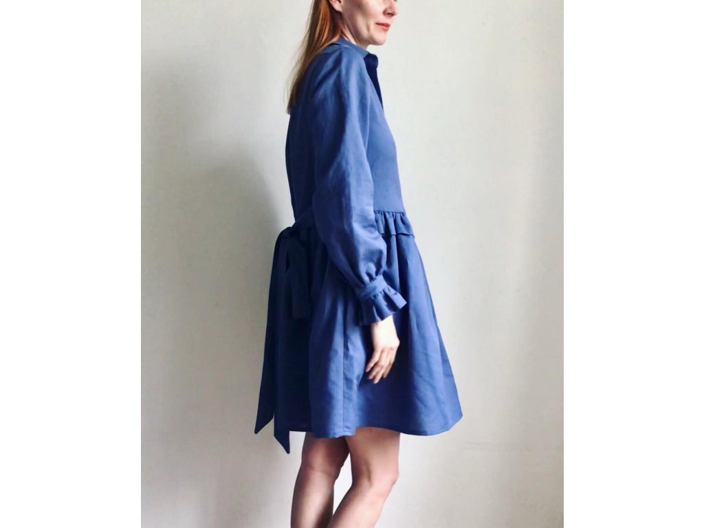 Šaty jsou volného střihu, v pase přestřižené, s kapsami v bočních švech a objemným volánem. Jsou doplněny řasenými manžetami na rukávech a límečkem. Vzadu mají dlouhou vázačku. Kombinace super střihu a krásné látky nemohla dopadnout lépe!